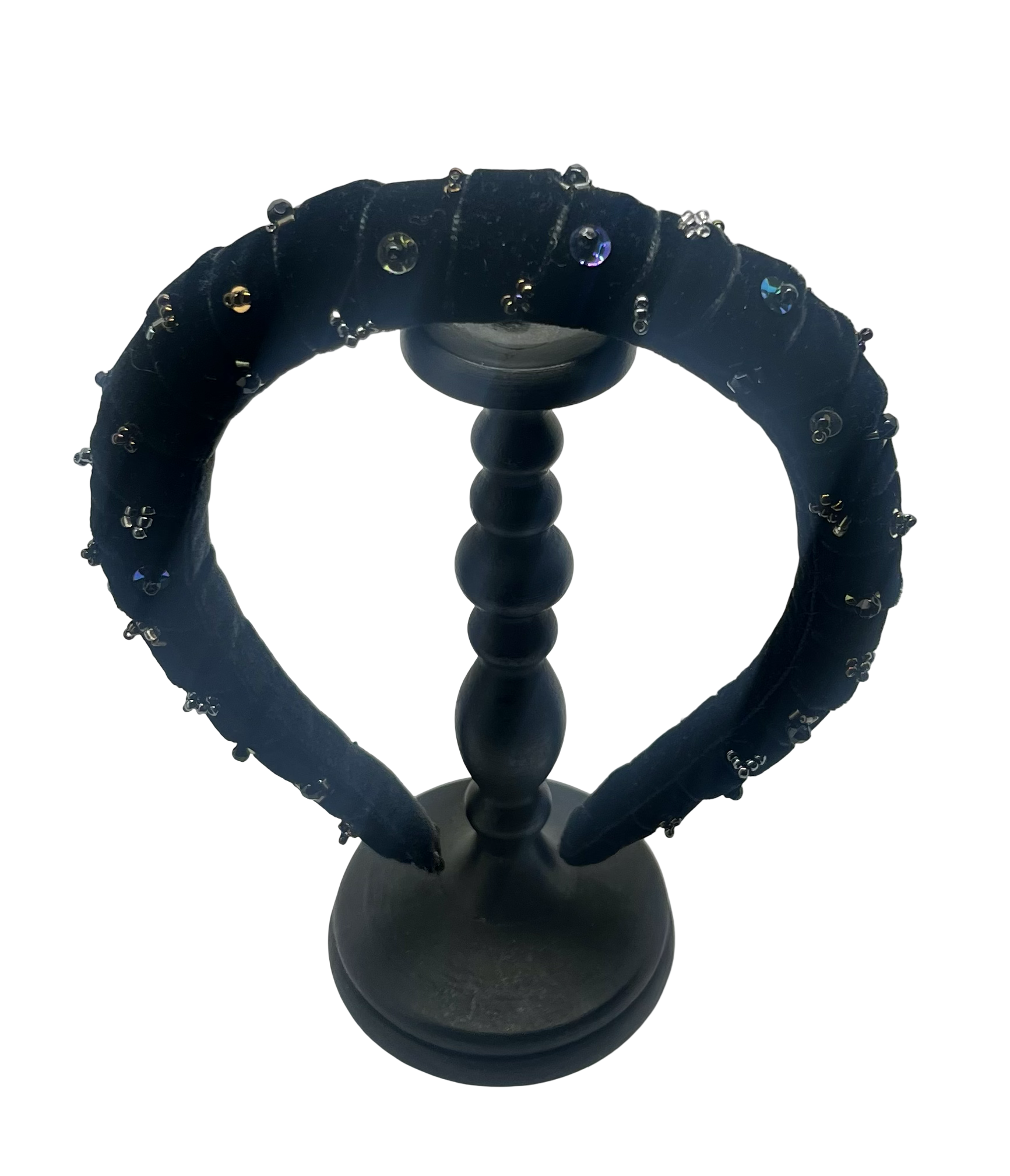 The Midnight Orbit headband evokes the poetry of a starlit sky. Built over a slim Bucatini base (2 cm width, 2 cm height) and wrapped in plush black velvet, it is delicately adorned with scattered crystals and jet-black beads, creating the illusion of a shimmering constellation in motion.