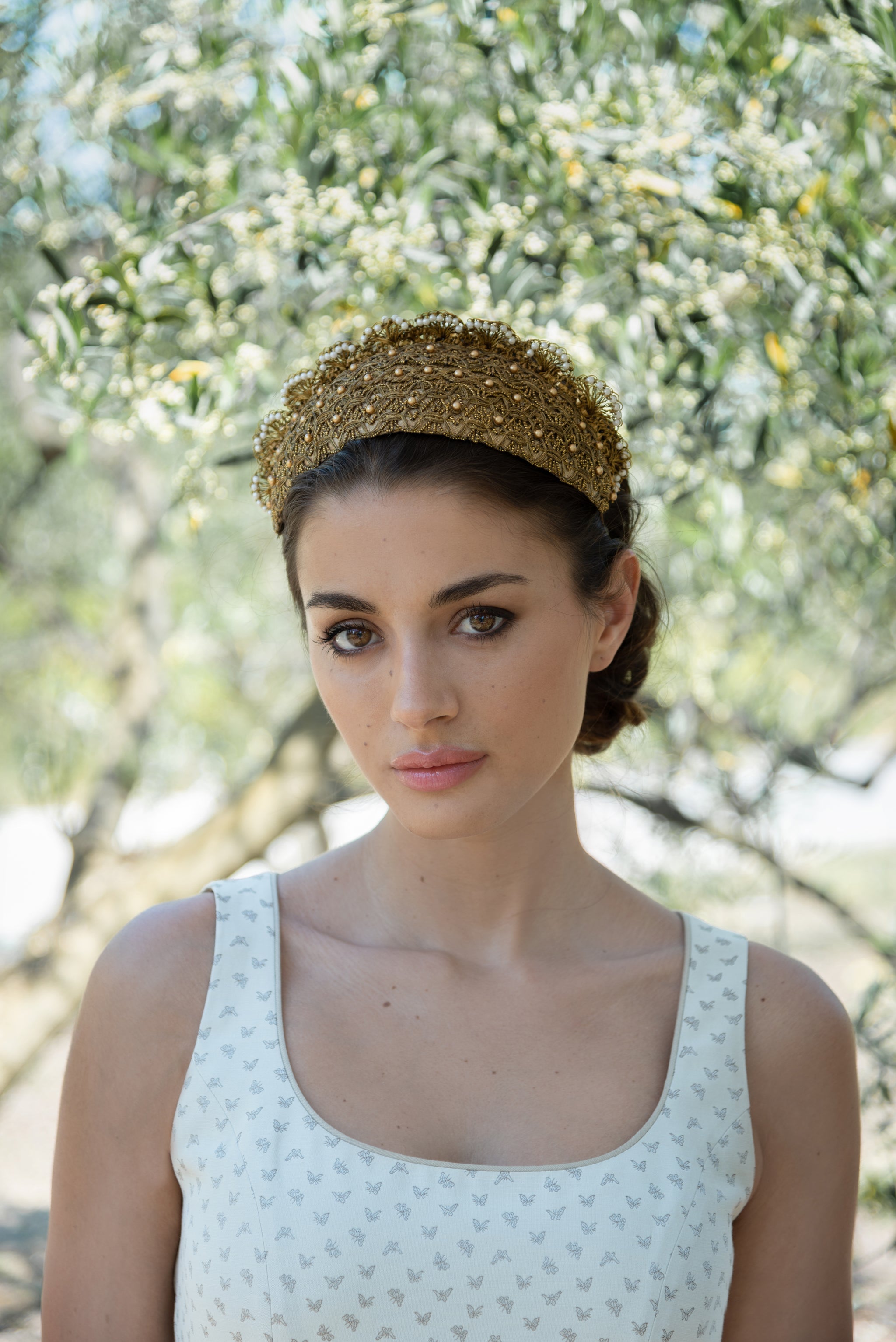 The centerpiece is a rare find: antique bronze metallic passementerie, richly braided and discovered during a textile-sourcing journey through Lisbon. This vintage trim forms the heart of the embellishment, winding across the headpiece with artisanal precision. Hand embroidery in golden and ivory acrylic pearls adds dimension and softness, elevating the piece into a sculptural jewel.