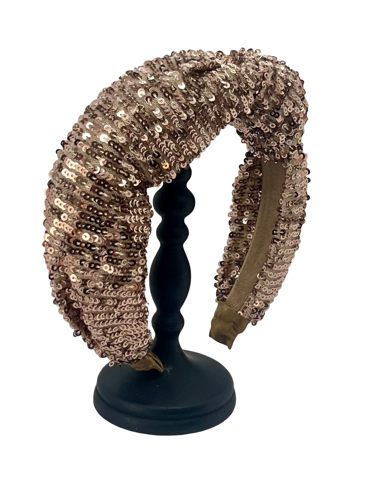A radiant ode to warmth and asymmetry. Solstice features a single, hand-crafted knot placed to the side — a sculptural accent that draws the eye with intention. Wrapped in copper-hued sequins, it shimmers with a sunset glow, while the caramel velvet lining offers comfort, tonal elegance, and a secure, slip-free fit. Measures 4 cm at the center, tapering to 2 cm at the tips, with a graceful arc that reaches approx. 8 cm in width. Handmade in our Viennese atelier.