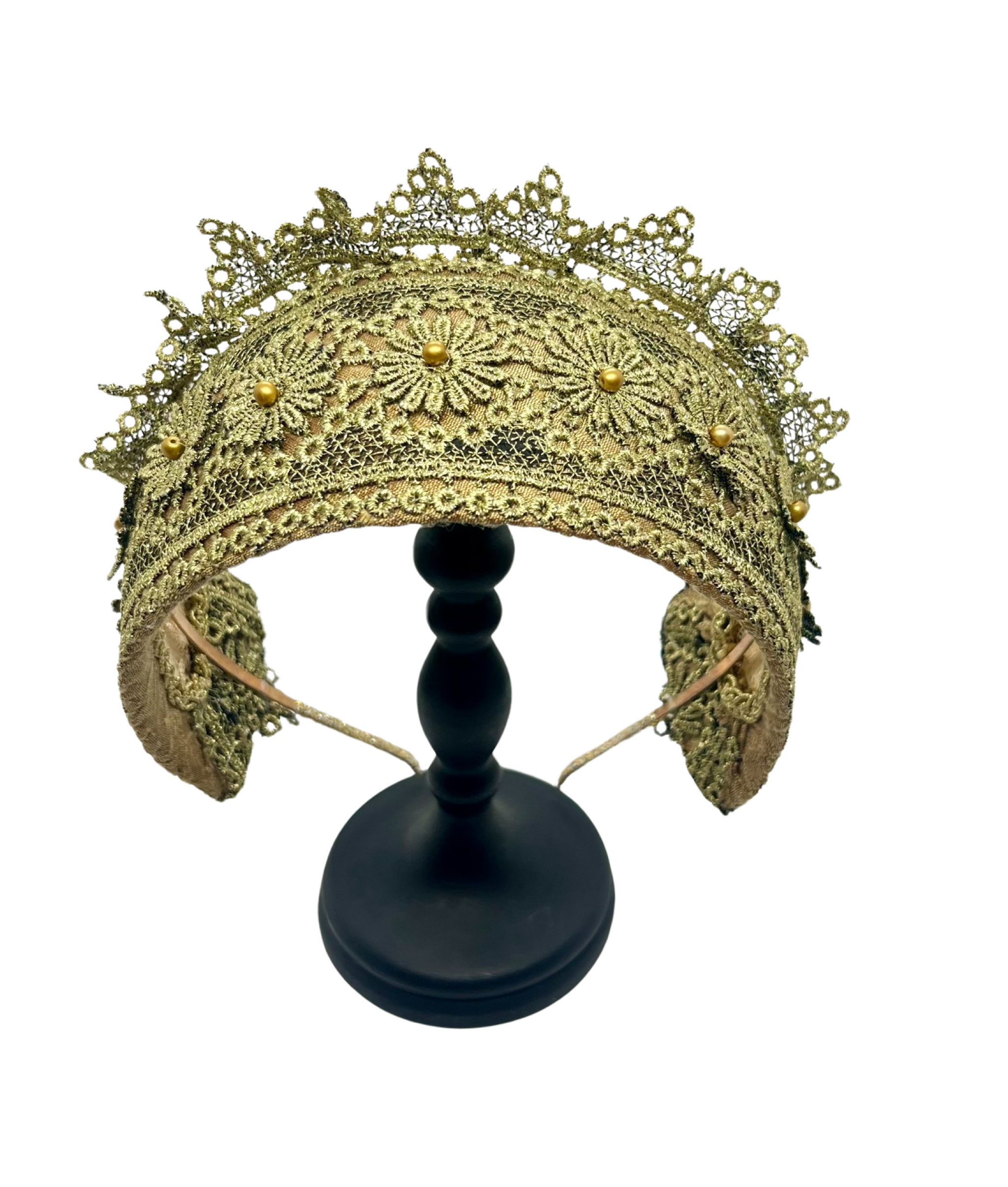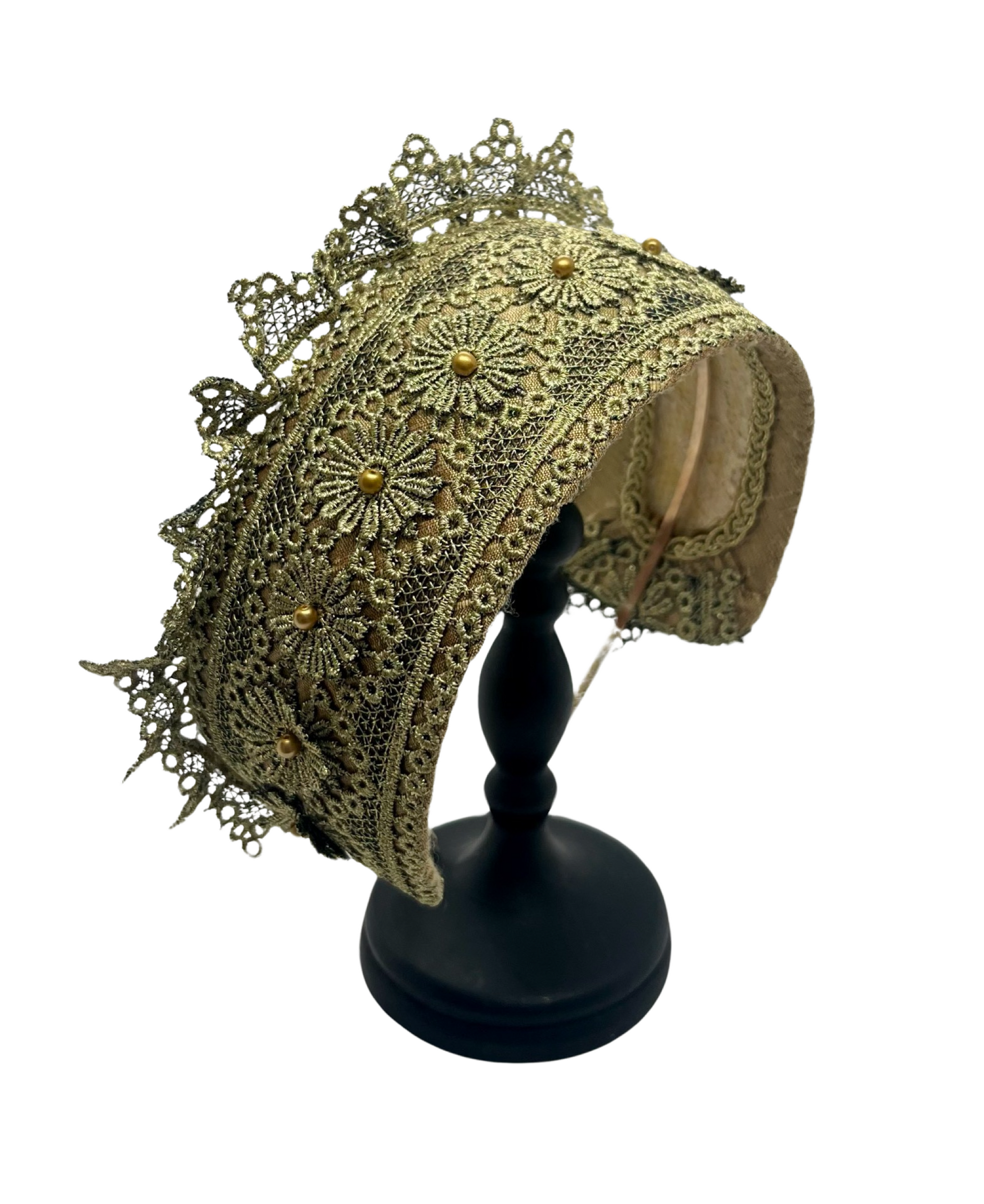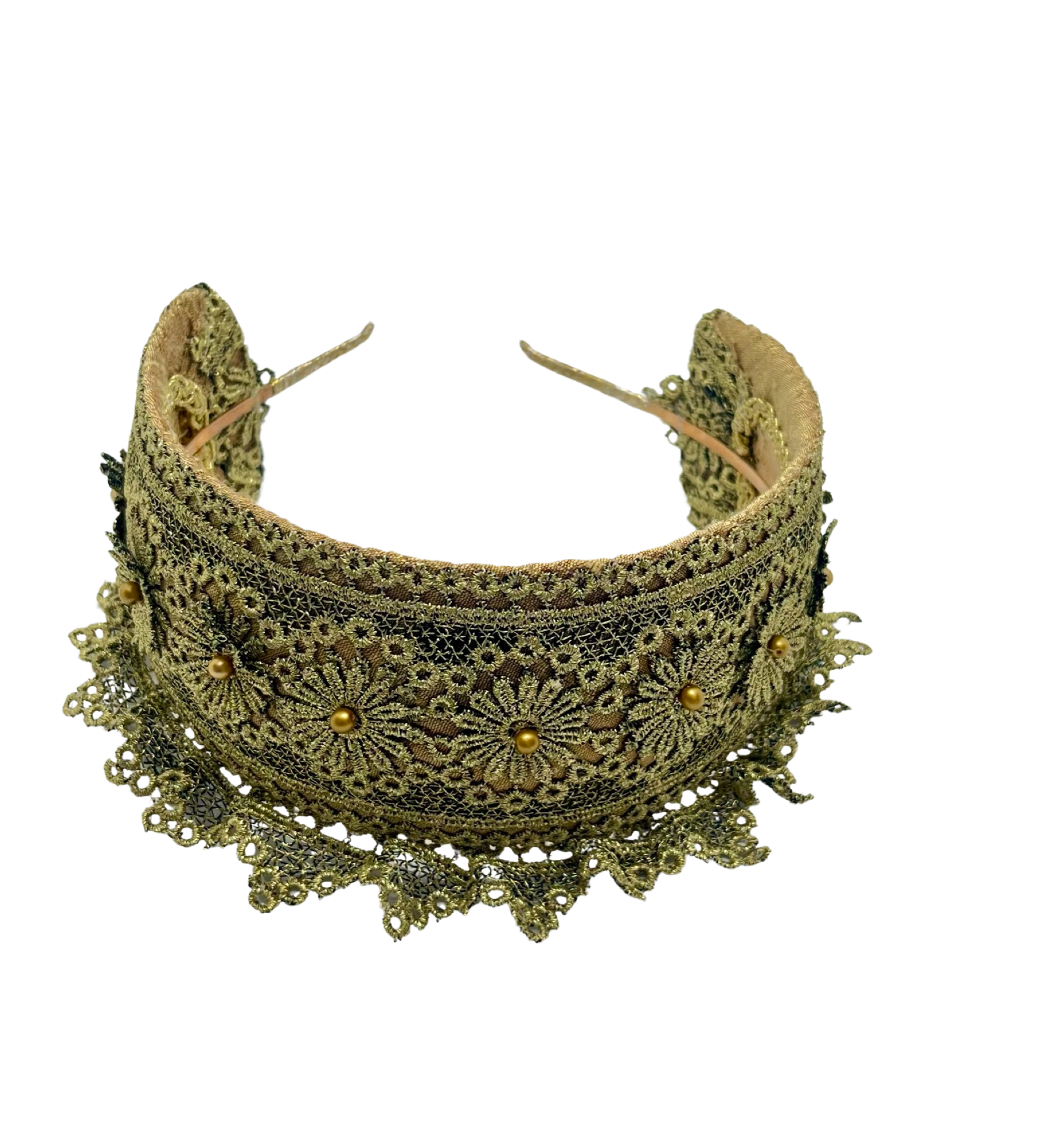 A delicate interplay of structure and softness. This Pure Gold Goldreifen is constructed on our signature, custom-made base, secured to a thin metal headband for a comfortably secure and pinch-free fit. It is lined in caramel gold silk dupion — warm, luminous, and timeless.